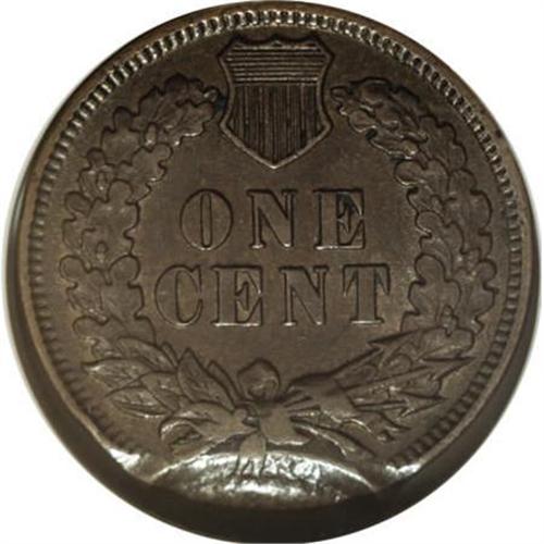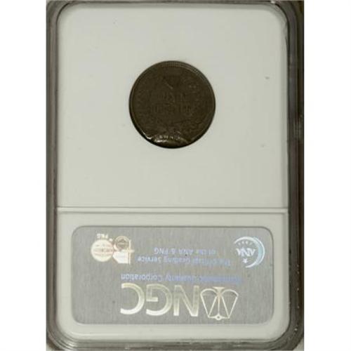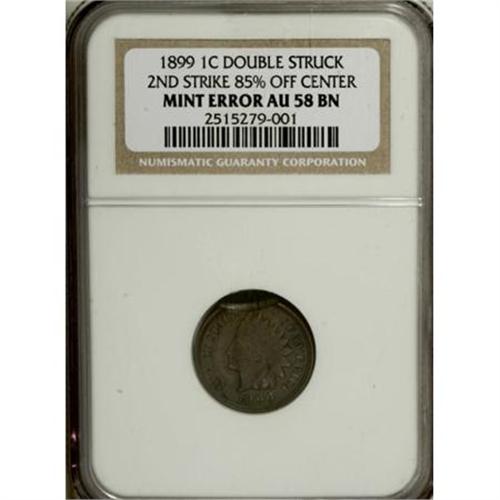 <B>1899 1C Indian Cent--Double Struck, Second Strike 85% Off Center--AU58 NGC.</B></I> The second strike is off center toward 6 o'clock, and is located at 12 o'clock relative to the first strike. The first strike is normal, the second strike is uniface. Remarkably, the second strike has a nearly complete date. This chocolate-brown piece appears Mint State aside from faint wear on the wreath ribbon, but has minor build-up near design recesses, and the cheek is moderately abraded.<BR><BR><b>Shipping:</b> Coins & Currency (<a target="_blank" href="http://www.heritageauctions.com/common/shipping.php">view shipping information</a>)