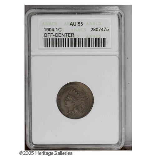 <B>1899<1C>--Double Struck, Cleaned--ANACS. AU53 Details,</B></I> a double-dated coin, boldly double struck at 12 o'clock, with the second strike off-center and north of the first by about 5%, glossy from cleaning but an attractive copper-bronze color, with slight circulation wear; and a <B>1904--Off Center--AU55 ANACS,</B></I> brown and struck about 5% off-center at 7 o'clock.