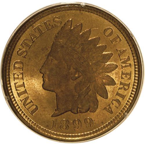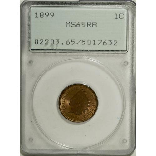 <B>1899 1C MS65 Red and Brown PCGS.</B></I> PCGS Population (78/3). NGC Census: (177/29). Mintage: 53,600,032. Numismedia Wsl. Price for NGC/PCGS coin in MS65: $124. (#2203)<BR><BR><b>Shipping:</b> Coins & Currency (<a target="_blank" href="http://www.heritageauctions.com/common/shipping.php">view shipping information</a>)