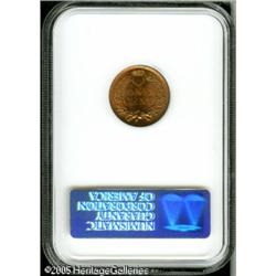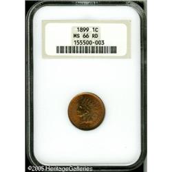 <B>1899 1C MS66 Red NGC.</B></I> Sharply struck with amazingly bright red-orange color over both sides, lit up by vibrant, full, frosty luster. Other than one or two really tiny nicks, on each side, and a single small carbon spot, near ten o'clock on the obverse rim, the piece seems pristine. An interesting glaze of silver-gray patina coats the higher points on the central obverse. Population: 52 in 66 Red, 7 finer (1/05). Lot:5246