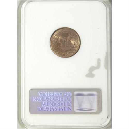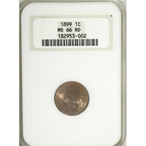 <B>1899 1C MS66 Red NGC.</B></I> Vibrant luster adorns orange-gold surfaces laced with whispers of mint-green. All four diamonds possess complete detail, but most of the feather tips are softly defined. Both sides are immaculately preserved and exhibit extreme "flash." Census: 51 in 66 Red, 8 finer (1/08).<BR><BR><B>Coin Engraver:</B> James B. Longacre<BR><BR><b>Shipping:</b> Coins & Currency (<a target="_blank" href="http://www.heritageauctions.com/common/shipping.php">view shipping information</a>)