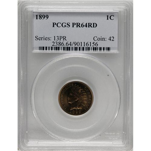 <B>1899 1C PR64 Red PCGS.</B></I> PCGS Population (37/73). NGC Census: (28/66). Mintage: 2,031. Numismedia Wsl. Price for NGC/PCGS coin in PR64: $340. (#2386)<BR><BR><b>Shipping:</b> Coins & Currency (<a target="_blank" href="http://www.heritageauctions.com/common/shipping.php">view shipping information</a>)