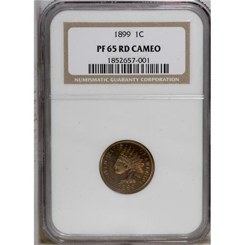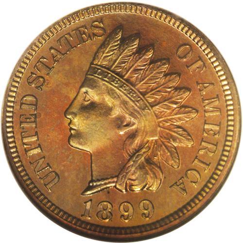 <B>1899<1C> PR65 Red Cameo NGC.</B></I> The base of the 1 in the date is repunched. Iridescent mint-green and rose-orange toning increases the eye appeal of this conditionally scarce Gem. Well struck with exquisitely preserved surfaces. Pleasing field-to-device contrast is evident on each side. A curly reverse lintmark is noted between the E in CENT and the wreath. This is the only 1899 Indian cent graded with both Red color and the Cameo designation, by NGC (9/06).