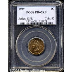 <B>1899<1C> PR65 Red and Brown PCGS.</B></I> The design features are well impressed, except for minor softness in the feather tips and in the hair curls just below the Indian's ribbon. Gold toning occupies both sides, accented by blushes of crimson on the reverse. A few flecks are scattered about, particularly on the obverse. Population: 50 in 65, 19 finer (3/04). <BR><BR><B>Important notice:</B> Heritage usually auctions material at the rate of 200-250 lots per hour. On some occasions eBay Live bid software or the Internet may not be able to keep up with the pace of the auction. We recommend placing a realistic absentee bid now as insurance to avoid disappointment. Occasionally the auctioneer may eliminate or reject an eBay Live bid, and the auctioneer may also reopen a lot after the close of the eBay live bidding (usually because we missed an audience bid), and may reject your bid even if it shows you as the winning bidder. By bidding via eBay Live, you agree that Heritage may award the lot to another bidder at its sole discretion under the circumstances described above or any other reasonable circumstances. Since eBay bids are not shown to us until we open the lot on the floor, we treat those bids just like floor bids. In most cases the floor responds before the eBay bid is presented to us, due to Internet lag time, so for consistency we have made it a policy that floor bids are always considered first over tie eBay live bids. Also please note that all Heritage lots purchased through eBay Live carry a 20% Buyer's Premium. Please make sure you read the Terms and Conditions before you bid. </span></font></tr></table></td></tr></table>