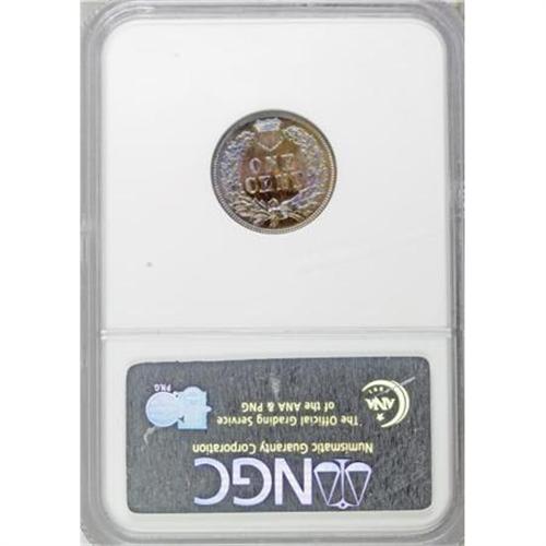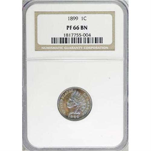 <B>1899 1C PR66 Brown NGC.</B></I> Sharply struck with lovely purple-rose and sky-blue toning. Free of contact marks or hairlines; an impressive Premium Gem proof from the final year of the 19th century. Census: 7 in 66 Brown, 1 finer (7/07). <BR><BR><B>Coin Engraver:</B> James B. Longacre<BR><BR><b>Shipping:</b> Coins & Currency (<a target="_blank" href="http://www.heritageauctions.com/common/shipping.php">view shipping information</a>)