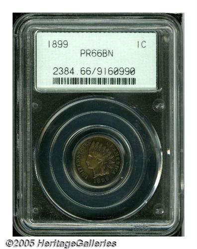 <B>1899<1C> PR66 Brown PCGS.</B></I> Golden-brown coloration dominates the obverse, while the reverse is mostly medium brown with subtle gold undertones. Whispers of medium-blue and lilac are also noted on each side. Sharply struck, with no mentionable marks to report. Only ten PR66 examples in this color designation have been seen by PCGS and NGC combined, with just one NGC-certified piece rating higher (3/05).