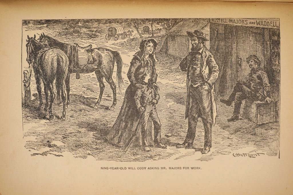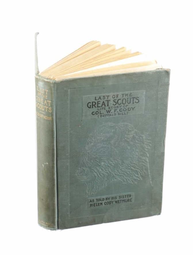 For your consideration is this 1899 First Edition of “Last of the Great Scouts: Life Story of Co. W.F. Cody (Buffalo Bill)” written by Helen Cody Wetmore. William F. Cody was known as the legendary Buffalo Bill. Born in a log cabin in Iowa, he was a buffalo hunter, stagecoach driver, Pony Express rider, Civil War soldier, and a scout for the U.S. army before beginning his career as the star of Buffalo Bill's Wild West, which electrified audiences around the world from 1883 to 1917. Bill's sister, Helen Cody Wetmore, writes an affectionate biography that recalls both the man and the legend, his colorful personality and ironic wit, as well as his celebrated international status. Before becoming a showman, Cody tried his luck as a land speculator, a hotelkeeper, and a justice of the peace. These pages also show the author herself growing up on the wild frontier. "Buffalo Bill" introduces us to an unforgettable and controversial figure in American frontier history. This green cloth bound gold gilt stamped hardcover is in good overall condition, scuffing noted to the edges, gold gilt is bright, front cover features a stamped illustration of a bison. Intact pages exhibit age tanning and foxing throughout, no other obvious marring observed. Measures 8.75"L x 6"W x 1"D, weight 1lb.*