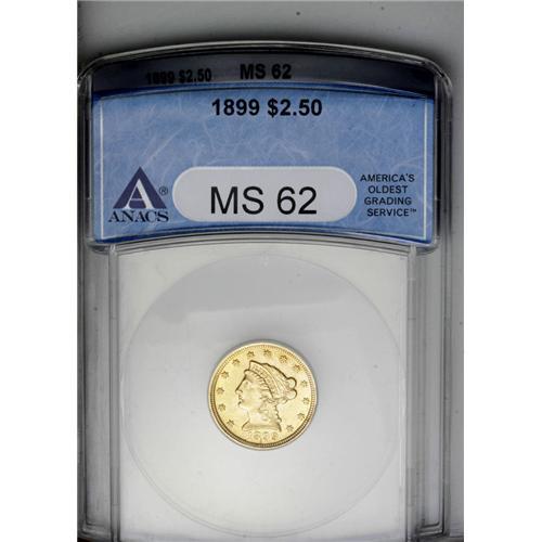<B>1899<$2 1/2> MS62 ANACS.</B></I> Well struck with enticing, deep khaki-gold color and shimmering luster. A few superficial marks are noted on each side of the coin.