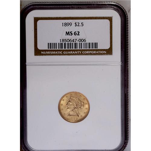 <B>1899<$2 1/2> MS62 NGC.</B></I> Rich golden color and bright luster which has a somewhat frosty texture. The reverse is nearly untouched, but the obverse shows a few minor hits and luster breaks.