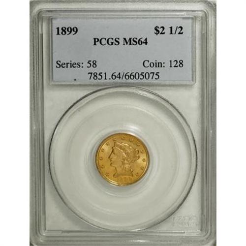 <B>1899 $2 1/2 MS64 PCGS.</B></I> PCGS Population (115/77). NGC Census: (122/89). Mintage: 27,200. Numismedia Wsl. Price for NGC/PCGS coin in MS64: $965. (#7851)<BR><BR><B>Coin Engraver:</B> Christian Gobrecht<BR><BR><b>Shipping:</b> Coins & Currency (<a target="_blank" href="http://www.heritageauctions.com/common/shipping.php">view shipping information</a>)