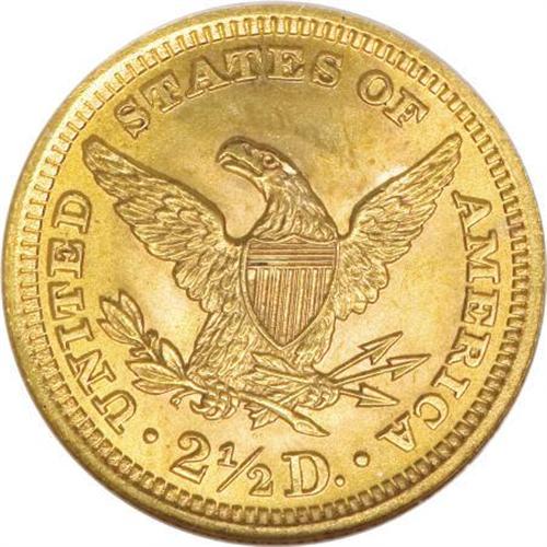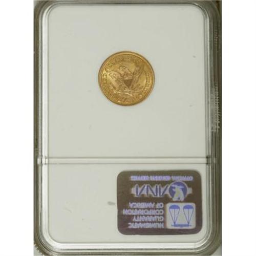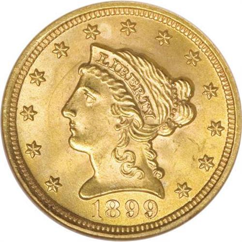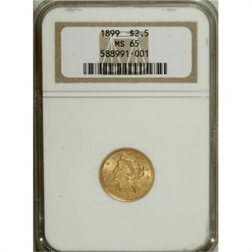 <B>1899 $2 1/2 MS65 NGC.</B></I> Quarter eagle mintages from late in the Liberty Head series are surprisingly low, a fact sometimes forgotten in the face of the relative abundance of half eagles from the same timeframe. In the case of the 1899 quarter eagle, for example, no more than 27,200 business strikes plus 150 proofs were produced, and yet it trades like an ordinary type coin. This Gem example offers exuberant luster over sharply struck antique-gold surfaces. A thin circular scrape, visible only at a certain angle, likely limits a potentially finer grade. Census: 46 in 65, 37 finer (6/07).<BR><BR><b>Shipping:</b> Coins & Currency (<a target="_blank" href="http://www.heritageauctions.com/common/shipping.php">view shipping information</a>)