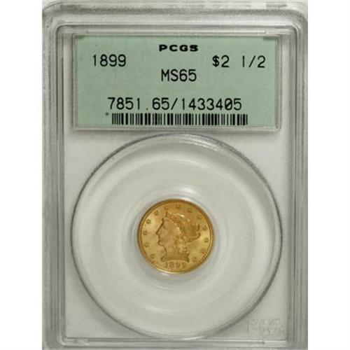<B>1899 $2 1/2 MS65 PCGS.</B></I> A meticulously struck and highly lustrous peach and lime-gold Gem with an exceptionally mark-free reverse. From a low mintage of 27,200 pieces. Housed in an old green label holder.<BR><BR><B>Coin Engraver:</B> Christian Gobrecht<BR><BR><b>Shipping:</b> Coins & Currency (<a target="_blank" href="http://www.heritageauctions.com/common/shipping.php">view shipping information</a>)
