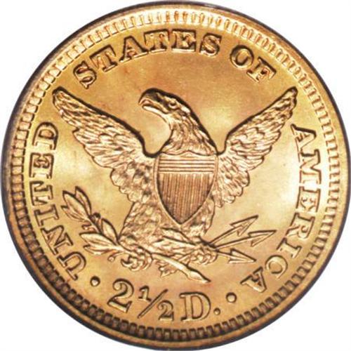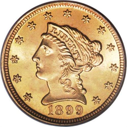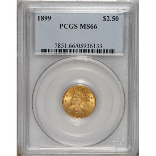 <B>1899 $2 1/2 MS66 PCGS.</B></I> The 27,200 pieces struck for this turn-of-the-century issue would be the last mintage for a circulating issue to be so low. This carefully preserved and delightful orange-gold example is one of the finest surviving representatives. The strongly lustrous and carefully preserved orange-gold surfaces host sharply struck devices with soft peach overtones. Population: 16 in 66, 4 finer (5/07).<BR><BR><b>Shipping:</b> Coins & Currency (<a target="_blank" href="http://www.heritageauctions.com/common/shipping.php">view shipping information</a>)