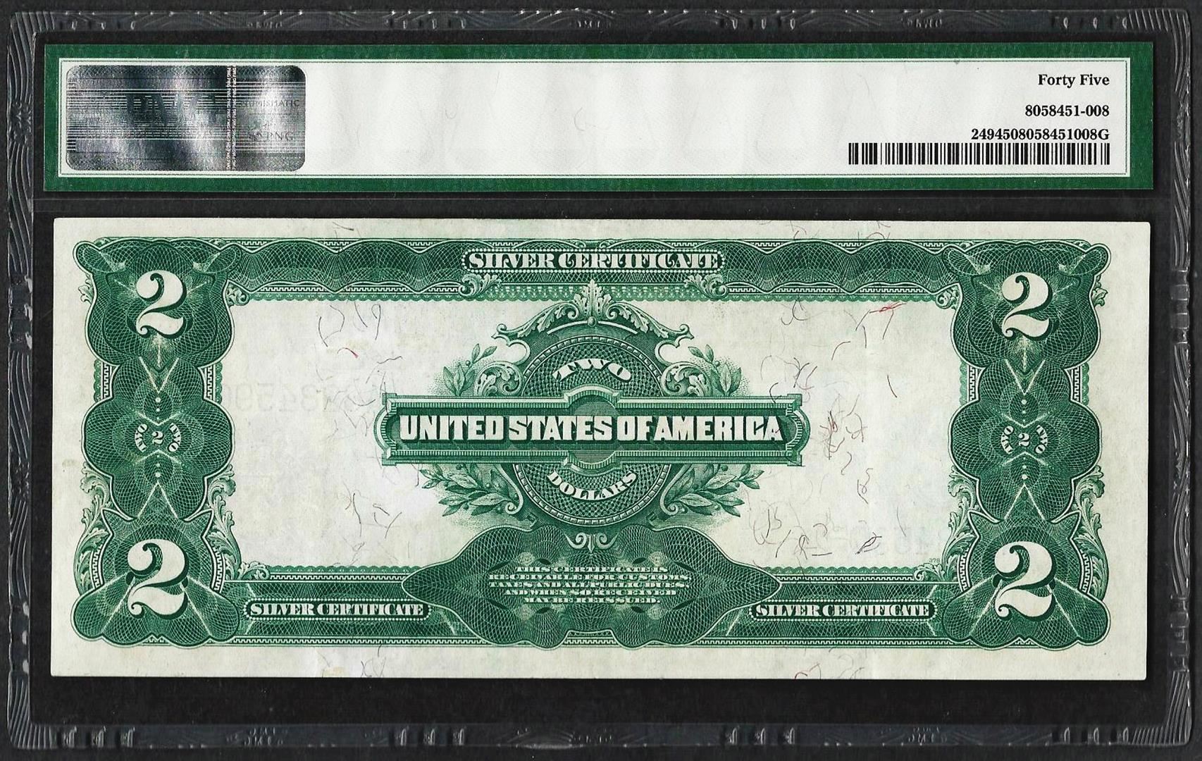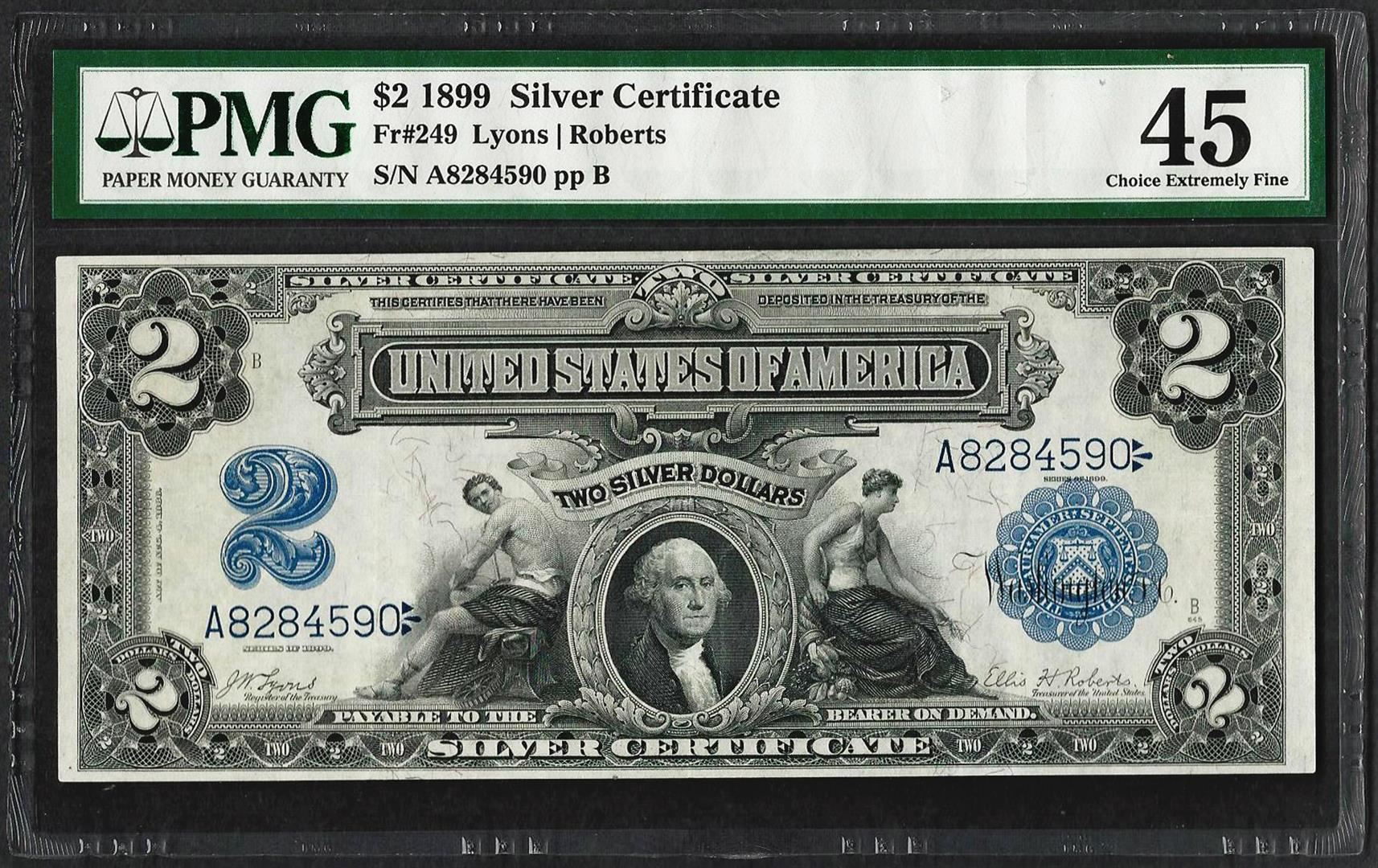 One 1899 $2 Mini-Porthole Silver Certificate Note Fr.249 PMG Extremely Fine 45. PMG Certified.
