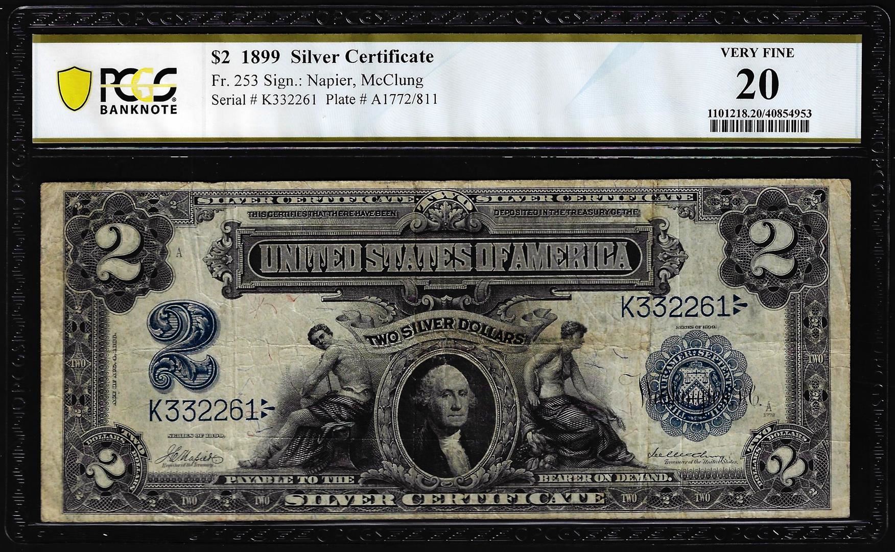 One 1899 $2 Mini-Porthole Silver Certificate Note Fr.253 PCGS Very Fine 20. PCGS Graded.