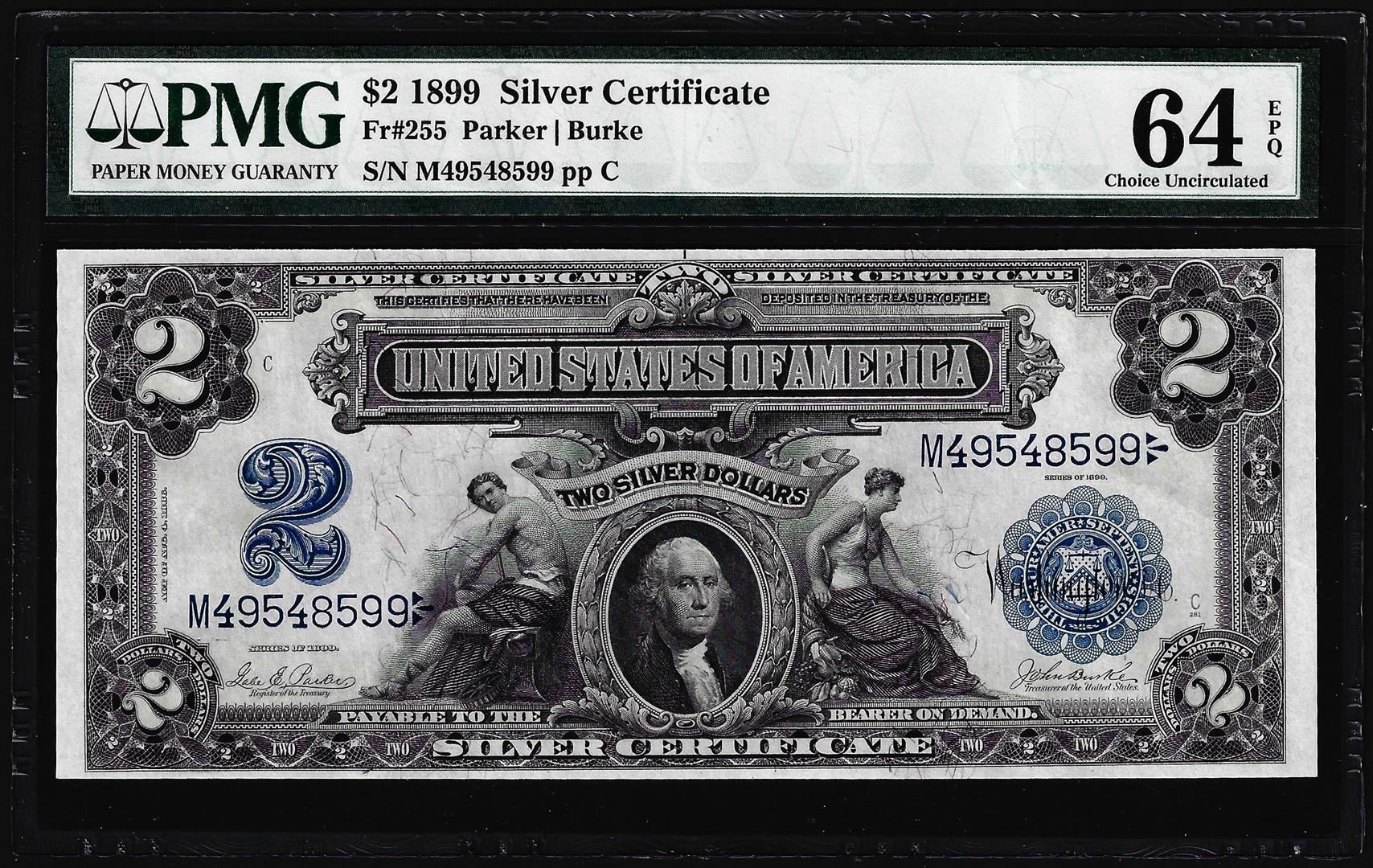 One 1899 $2 Mini-Porthole Silver Certificate Note Fr.255 PMG Choice Uncirculated 64EPQ. PMG Certified.