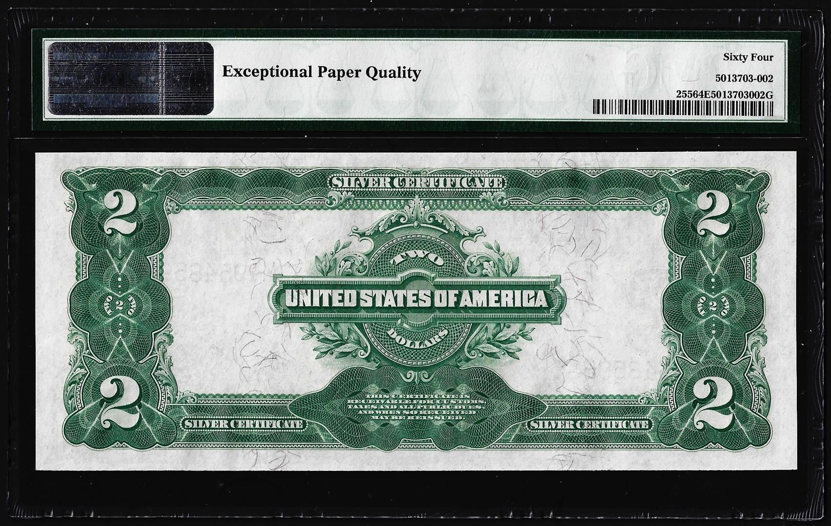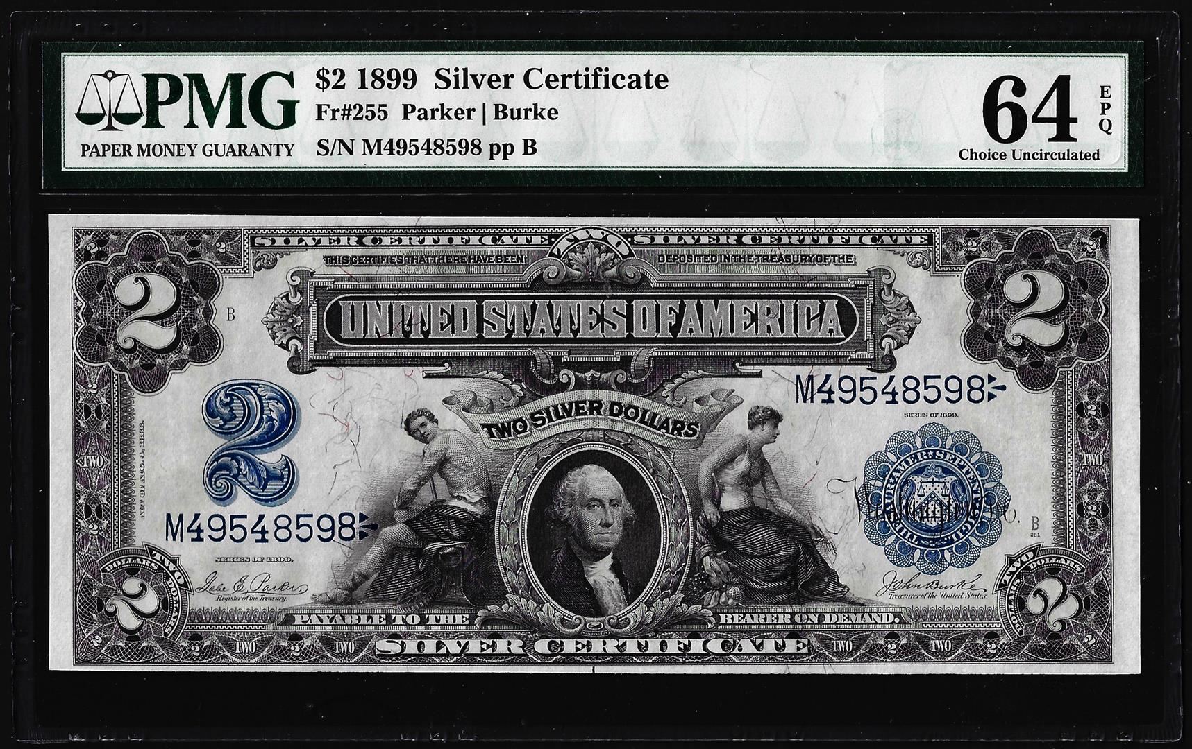 One 1899 $2 Mini-Porthole Silver Certificate Note Fr.255 PMG Choice Uncirculated 64EPQ. PMG Certified.