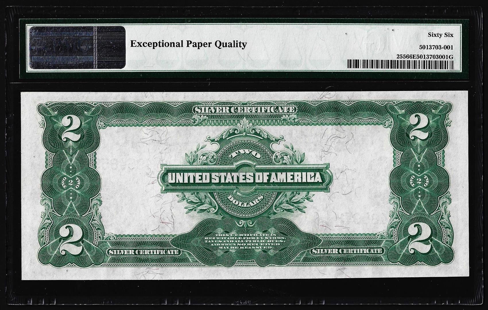 One 1899 $2 Mini-Porthole Silver Certificate Note Fr.255 PMG Gem Uncirculated 66EPQ. PMG Certified.
