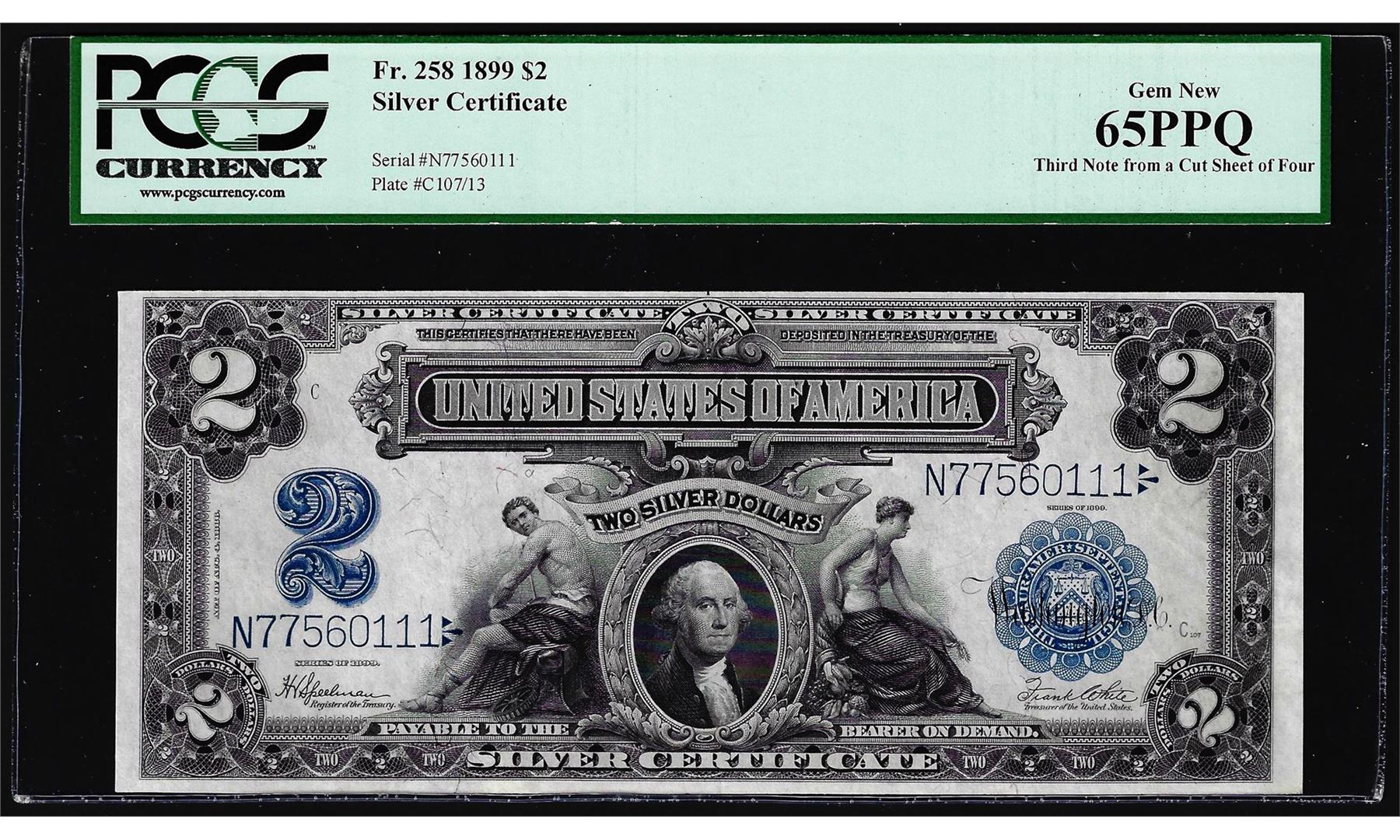 One 1899 $2 Mini-Porthole Silver Certificate Note Fr.258 PCGS Gem New 65PPQ. PCGS Graded.