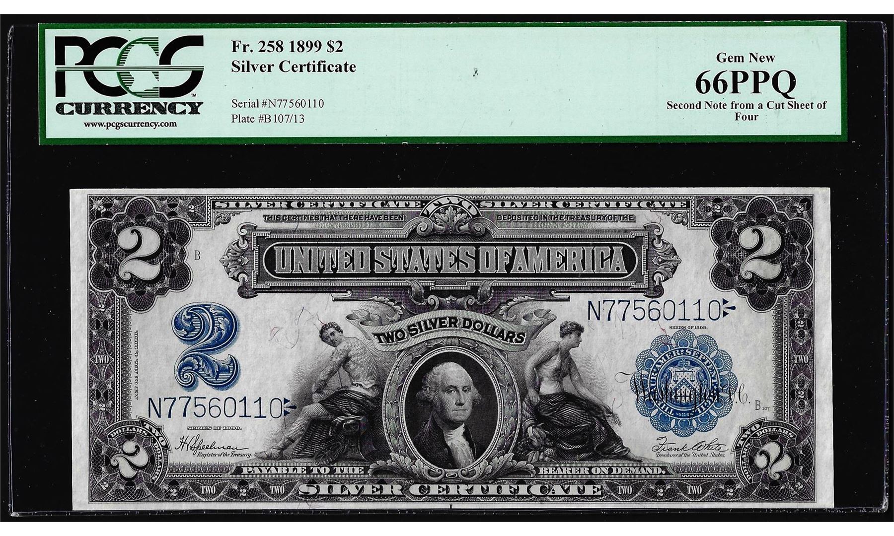 One 1899 $2 Mini-Porthole Silver Certificate Note Fr.258 PCGS Gem New 66PPQ. PCGS Graded.