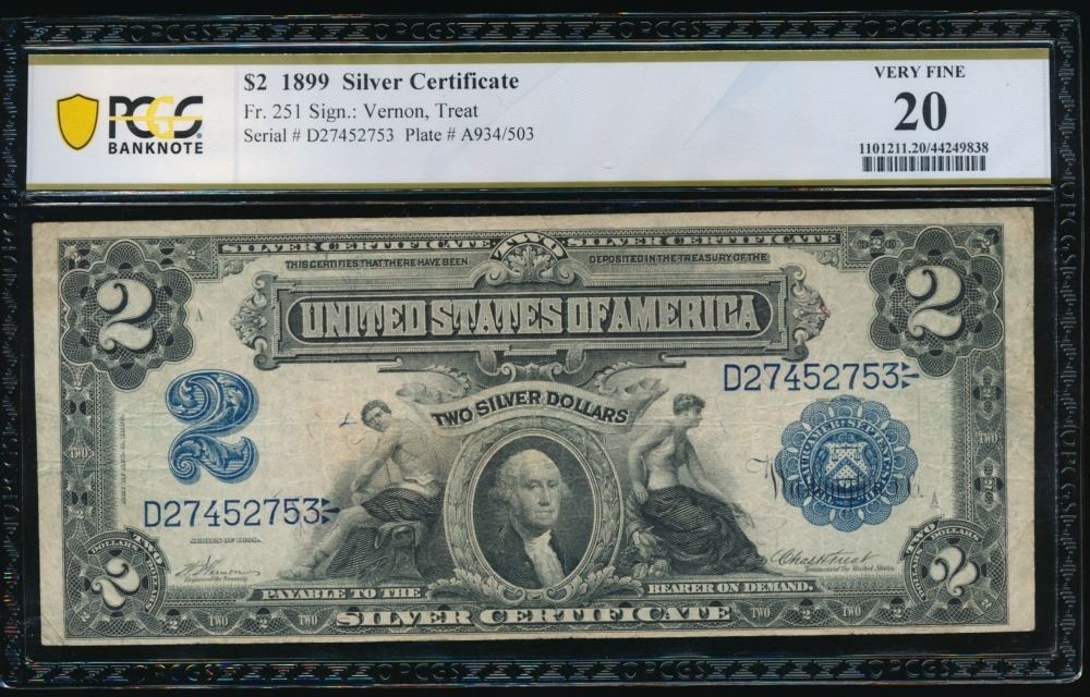 One 1899 $2 Mini Porthole Silver Certificate PCGS 20.