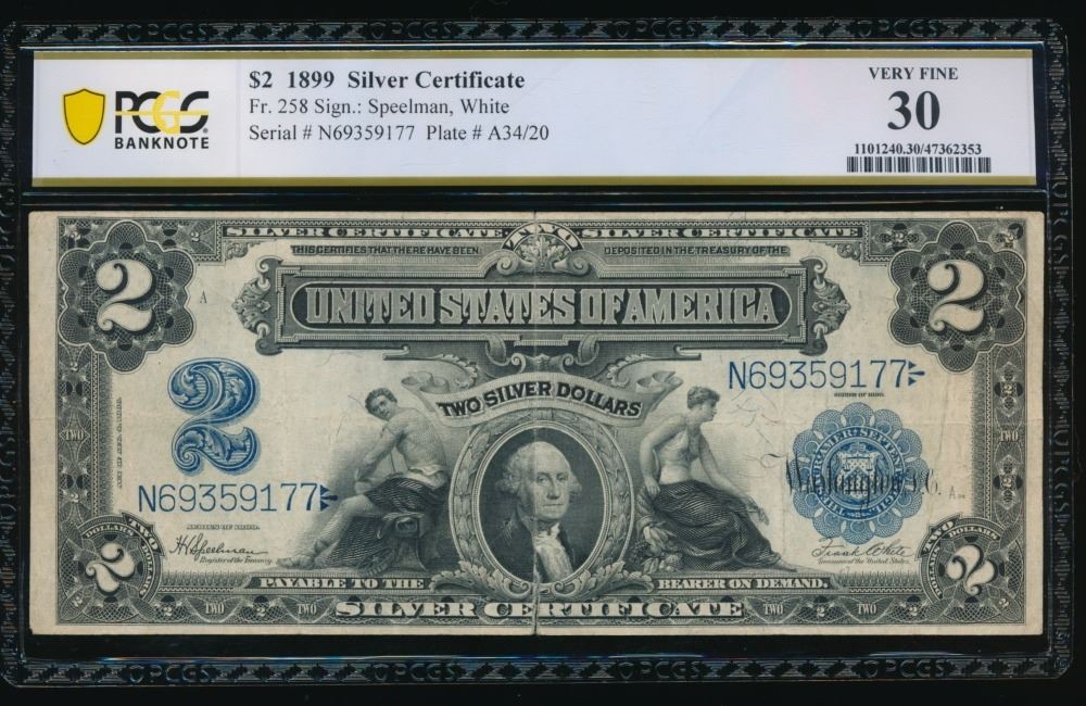 One 1899 $2 Mini Porthole Silver Certificate PCGS 30.