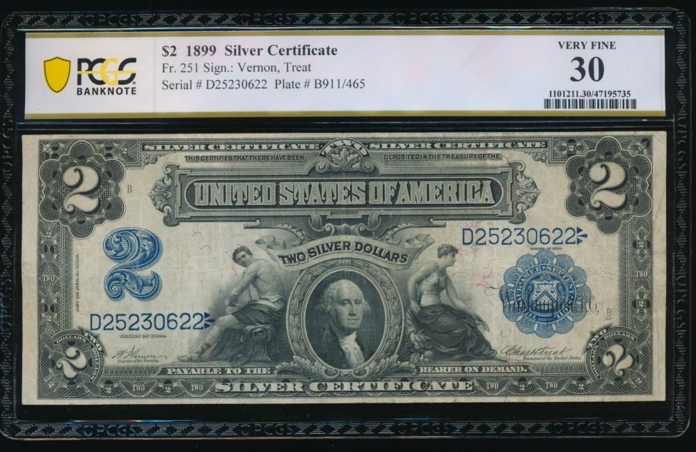 One 1899 $2 Mini Porthole Silver Certificate PCGS 30.