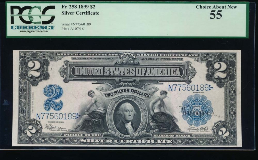 One 1899 $2 Mini Porthole Silver Certificate PCGS 55.