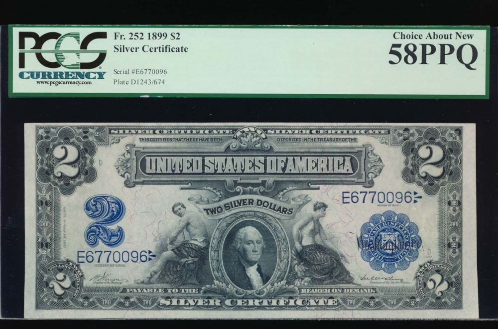 One 1899 $2 Mini Porthole Silver Certificate PCGS 58PPQ.