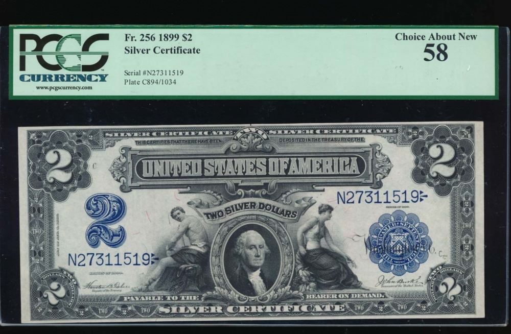 One 1899 $2 Mini Porthole Silver Certificate PCGS 58.