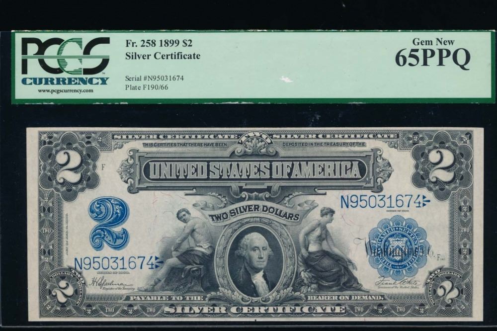 One 1899 $2 Mini Porthole Silver Certificate PCGS 65PPQ.