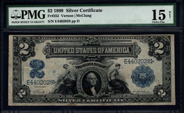 One 1899 $2 Mini Porthole Silver Certificate PMG 15NET.