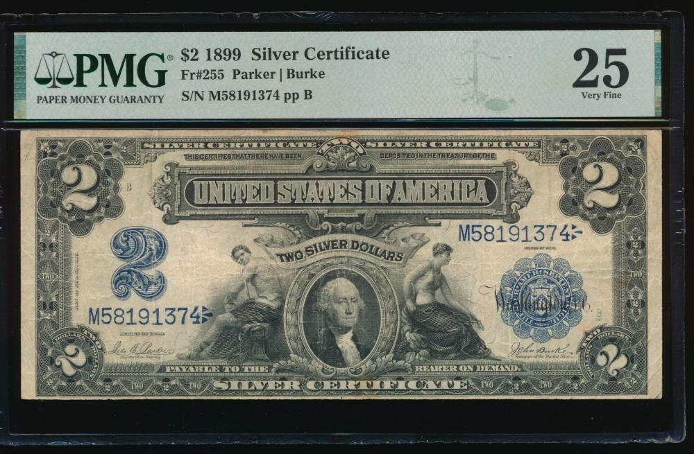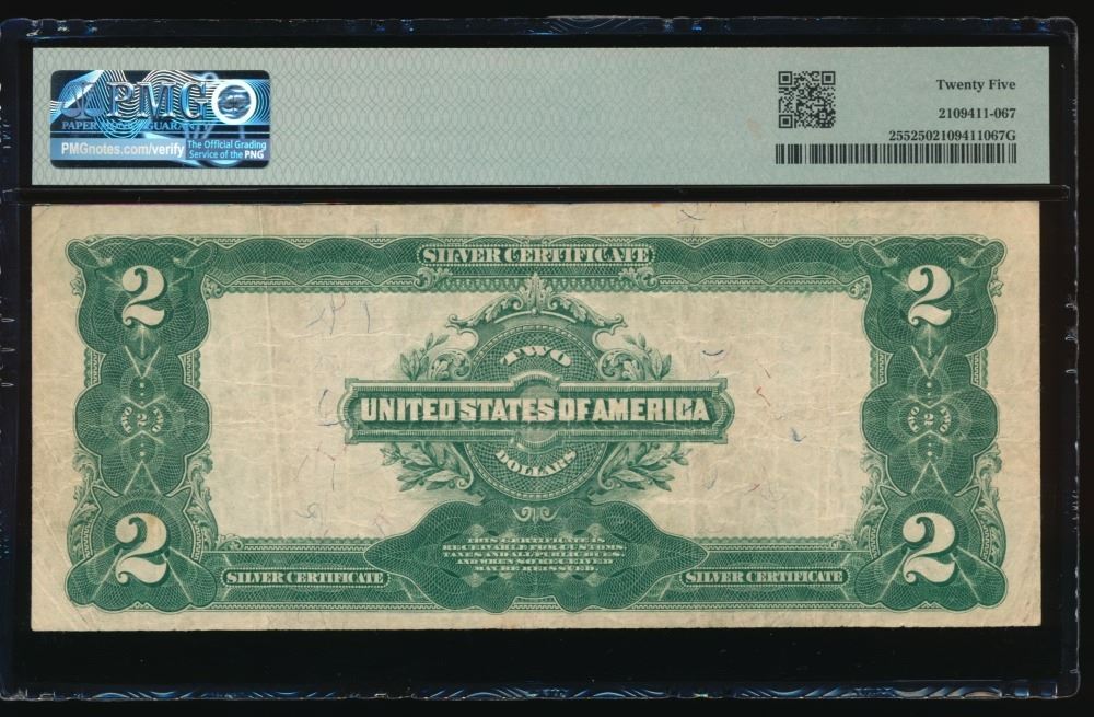 One 1899 $2 Mini Porthole Silver Certificate PMG 25.
