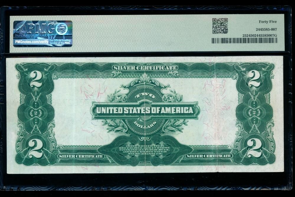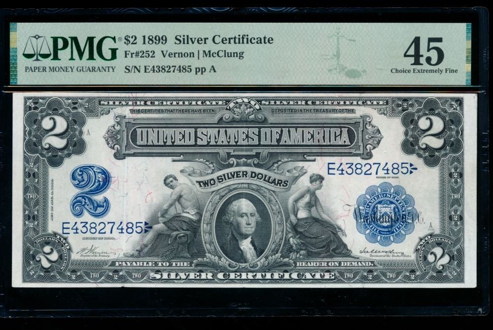One 1899 $2 Mini Porthole Silver Certificate PMG 45.