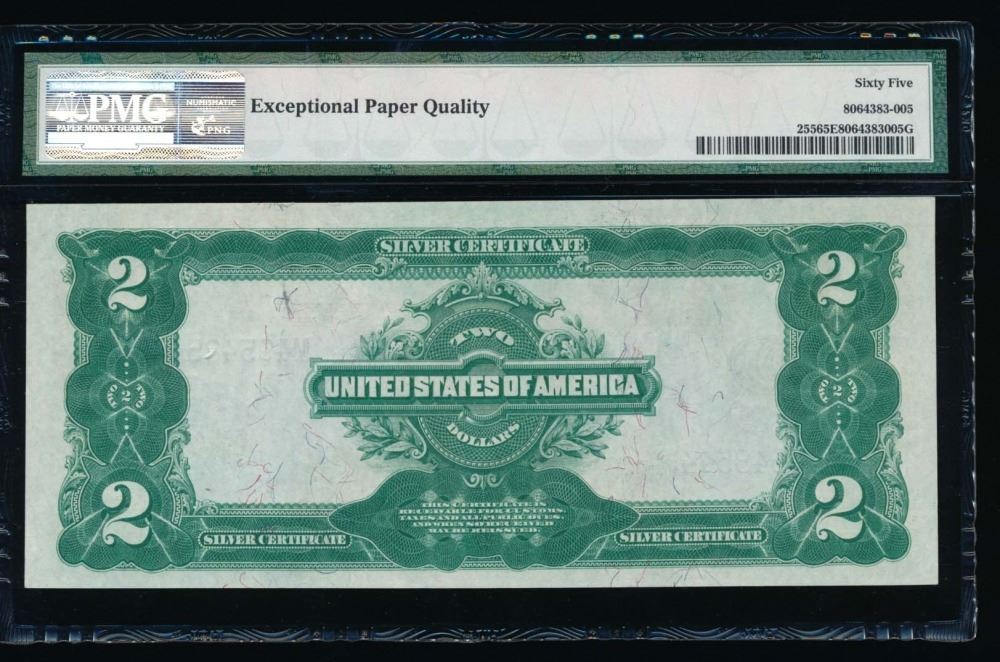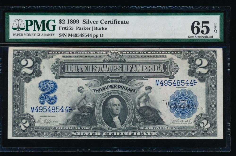 One 1899 $2 Mini Porthole Silver Certificate PMG 65EPQ.