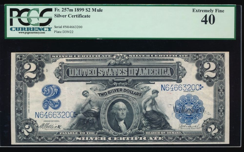 One 1899 $2 Washington Silver Certificate PCGS 40.
