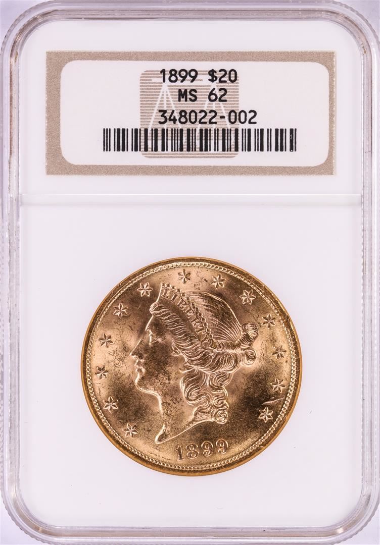 One 1899 $20 Liberty Head Double Eagle Gold Coin NGC MS62. NGC Certified.
