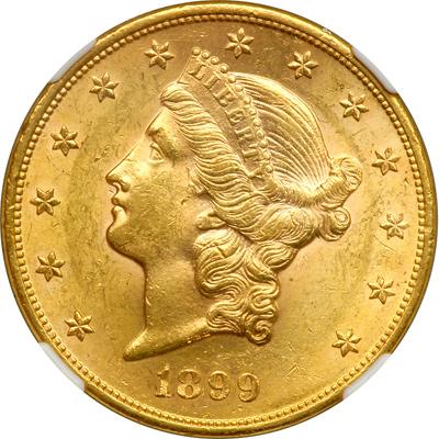 1899 $20 Liberty. NGC graded MS-61. Lustrous (PCGS # 9035) .
