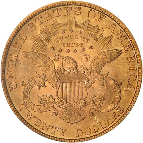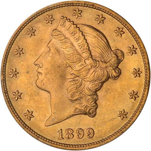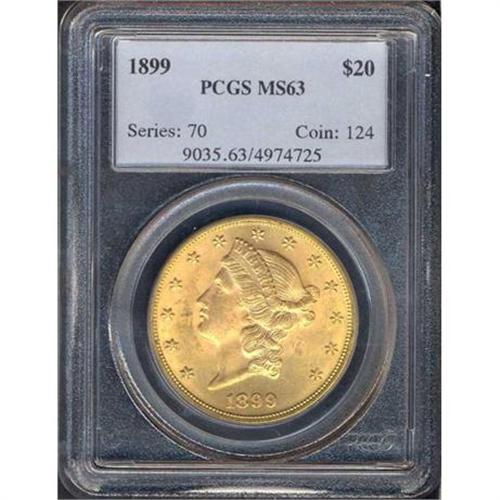 <b>1899 $20 Liberty. PCGS graded MS63.</b> From center to periphery the intense radiant golden luster glows. Meticulous strike on every device is what collectors hope for in a nice MS63 like this, and the coin being offered, unlike those that don't quite earn the "full" grade, is extra crisp, twice as sharp as an average specimen. For that reason, the numerical condition is exact <b>(PCGS # 9035)</b> <i>