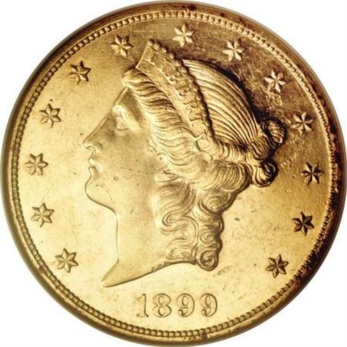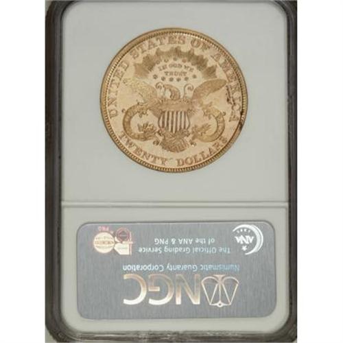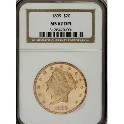 <B>1899 $20 MS62 Deep Mirror Prooflike NGC.</B></I> Years ago Prooflike twenty dollar Liberties were occasionally encountered, but there was no real market for them. Today they are highly collectible and bring a significant premium for their beauty. This is a brightly mirrored example that has the expected number of small abrasions in the obverse fields, but the reverse is remarkably clean. Light, even reddish color. The sole example certified as Deep Mirror Prooflike (3/08).<BR><BR><B>Coin Engraver:</B> James B. Longacre<BR><BR><b>Shipping:</b> Coins & Currency (<a target="_blank" href="http://www.heritageauctions.com/common/shipping.php">view shipping information</a>)
