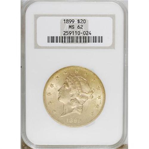 <B>1899 $20 MS62 NGC.</B></I> NGC Census: (6417/4313). PCGS Population (4170/1768). Mintage: 1,669,384. Numismedia Wsl. Price for NGC/PCGS coin in MS62: $935. (#9035)<BR><BR><B>Coin Engraver:</B> James B. Longacre<BR><BR><b>Shipping:</b> Coins & Currency (<a target="_blank" href="http://www.heritageauctions.com/common/shipping.php">view shipping information</a>)