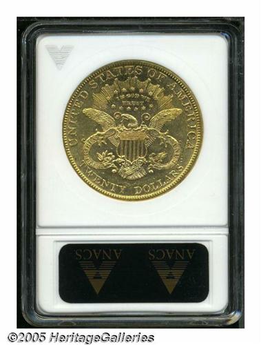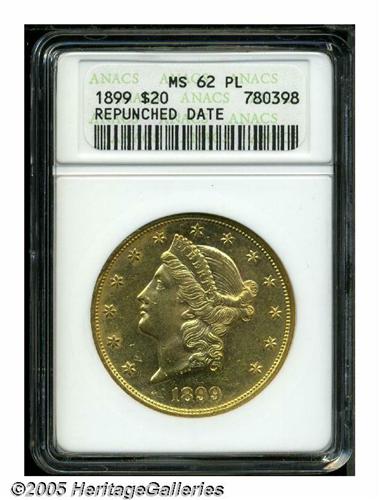 <B>1899<$20> MS62 Prooflike ANACS.</B></I> Repunched Date. Well struck with flashy, deeply reflective, prooflike fields and the normal number of scattered surface marks for the grade. The 9s in the date reveal minor repunching.