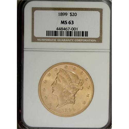 <B>1899 $20 MS63 NGC.</B></I> NGC Census: (3468/903). PCGS Population (1479/329). Mintage: 1,669,384. Numismedia Wsl. Price for NGC/PCGS coin in MS63: $1,350. (#9035)<BR><BR><B>Coin Engraver:</B> James B. Longacre<BR><BR><b>Shipping:</b> Coins & Currency (<a target="_blank" href="http://www.heritageauctions.com/common/shipping.php">view shipping information</a>)