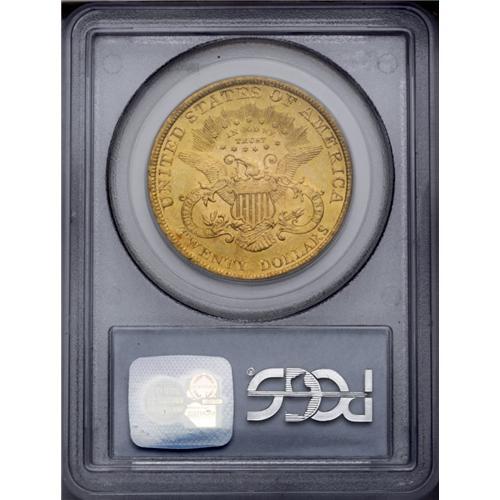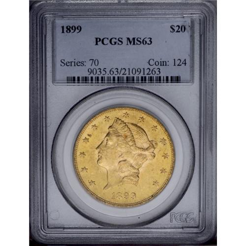 <B>1899<$20> MS63 PCGS.</B></I> Sharply struck with peach-gold lustrous surfaces. Several mentionable contact marks on the obverse limit the grade on this pleasing double eagle. <BR><BR><B>Important notice:</B> Heritage usually auctions material at the rate of 200-250 lots per hour. On some occasions eBay Live bid software or the Internet may not be able to keep up with the pace of the auction. We recommend placing a realistic absentee bid now as insurance to avoid disappointment. Occasionally the auctioneer may eliminate or reject an eBay Live bid, and the auctioneer may also reopen a lot after the close of the eBay live bidding (usually because we missed an audience bid), and may reject your bid even if it shows you as the winning bidder. By bidding via eBay Live, you agree that Heritage may award the lot to another bidder at its sole discretion under the circumstances described above or any other reasonable circumstances. Since eBay bids are not shown to us until we open the lot on the floor, we treat those bids just like floor bids. In most cases the floor responds before the eBay bid is presented to us, due to Internet lag time, so for consistency we have made it a policy that floor bids are always considered first over tie eBay live bids. Also please note that all Heritage lots purchased through eBay Live carry a 20% Buyer's Premium. Please make sure you read the Terms and Conditions before you bid. This lot is being auctioned in conjunction with a live floor auction by Heritage Galleries & Auctioneers. All final auction and invoice information will be supplied by Heritage Galleries & Auctioneers, and all other information should be considered preliminary. Lot:4388 <BR><BR><B>Winning Notification and Billing:</B> After the FINAL session in this auction is complete, Heritage will send e-mail and snail mail invoices. This process normally takes several days. All final auction and invoice information will be supplied by Heritage Galleries & Auctioneers, and all other information should be considered preliminary. <BR><BR>This auction will be conducted on a live auction floor and over the Internet through eBay Live. If you choose to place an absentee bid, please take a moment to <font color='#0000ff'><u><a href='http://pages.ebay.com/liveauctions/help/before/laabsentee.html'>learn how eBay Live absentee bidding works</a></u></font><font color='#000000'>