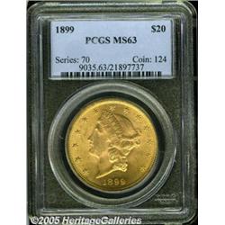 <B>1899 $20 MS63 PCGS.</B></I> This well struck double eagle displays apricot-gold patina with faint green and tan undertones that overlay softly lustrous surfaces. A few minute obverse marks limit the grade.
