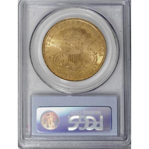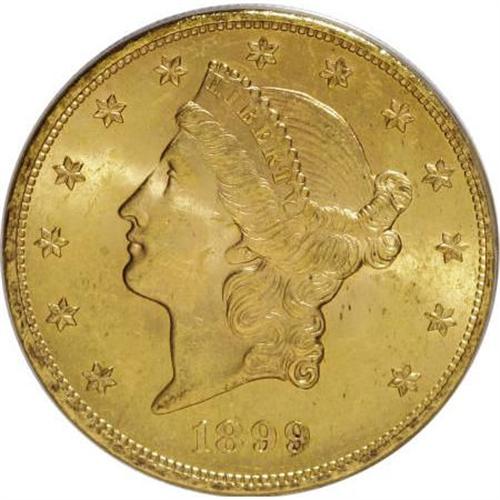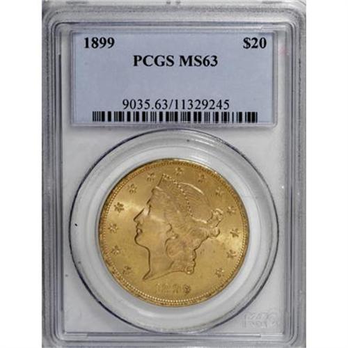 <B>1899 $20 MS63 PCGS.</B></I> PCGS Population (1395/291). NGC Census: (3388/882). Mintage: 1,669,384. Numismedia Wsl. Price for NGC/PCGS coin in MS63: $935. (#9035)<BR><BR><B>Coin Engraver:</B> James B. Longacre<BR><BR><b>Shipping:</b> Coins & Currency (<a target="_blank" href="http://www.heritageauctions.com/common/shipping.php">view shipping information</a>\)