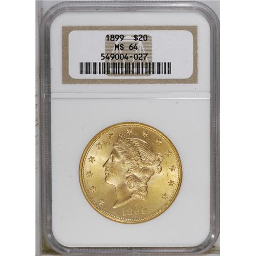 1899 $20 MS64 NGC. A gleaming yellow-gold piece that h