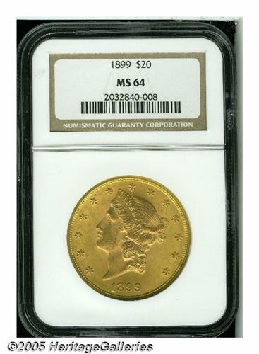 1899 $20 MS64 NGC. Sharply struck and lustrous, w