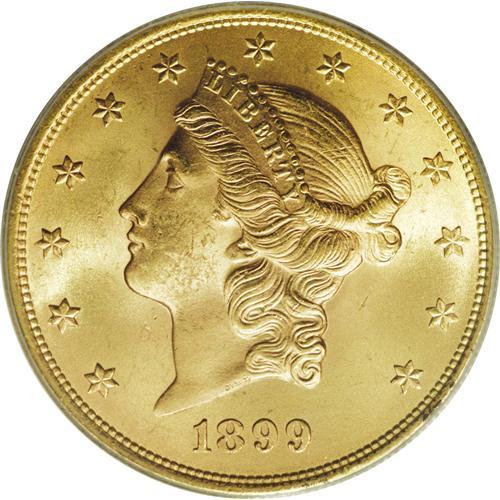 <B>1899 $20 MS64 PCGS.</B></I> A brilliant honey-gold coin that has sharply struck devices and gleaming luster. Only a few isolated areas with abrasions and very few marks are visible on this near-Gem piece. This coin has outstanding eye appeal and should be considered as a very suitable example for the year.<BR><BR><b>Shipping:</b> Coin/Currency (<a target="_blank" href="http://www.heritageauctions.com/common/shipping.php">view shipping information</a>)