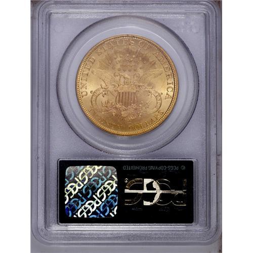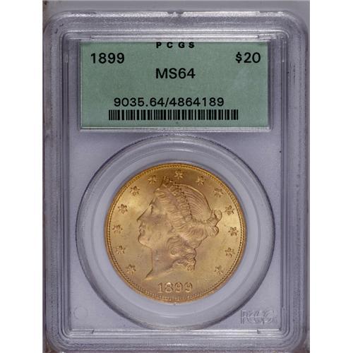 <B>1899 $20 MS64 PCGS.</B></I> A charming peach-gold near-Gem with clean, lustrous fields and an exemplary strike. Minor contact on the portrait is all that limits the grade. Encapsulated in a green label holder. PCGS has certified a mere seven pieces finer.